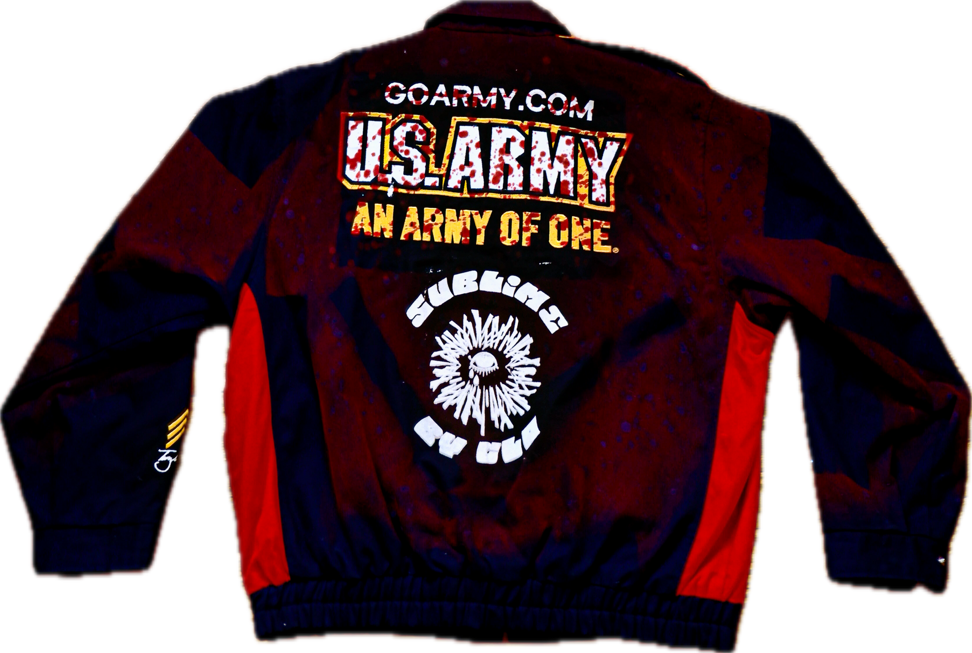 XL Original U.S. Army racing jacket. Spray-painted with blood reds. The front and back retain embroidered U.S. Army branding with the slogan “An Army of One,”.