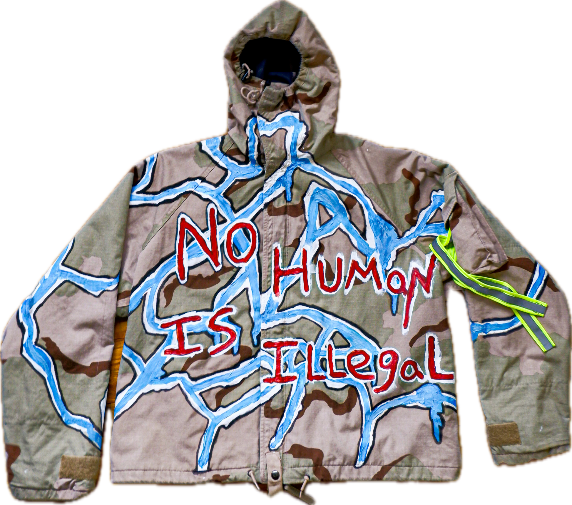 Medium Desert camo CHEM Gear Jacket hand-painted .“SUBLIME by CLo” logo on back, while the front declares "NO HUMAN IS ILLEGAL".