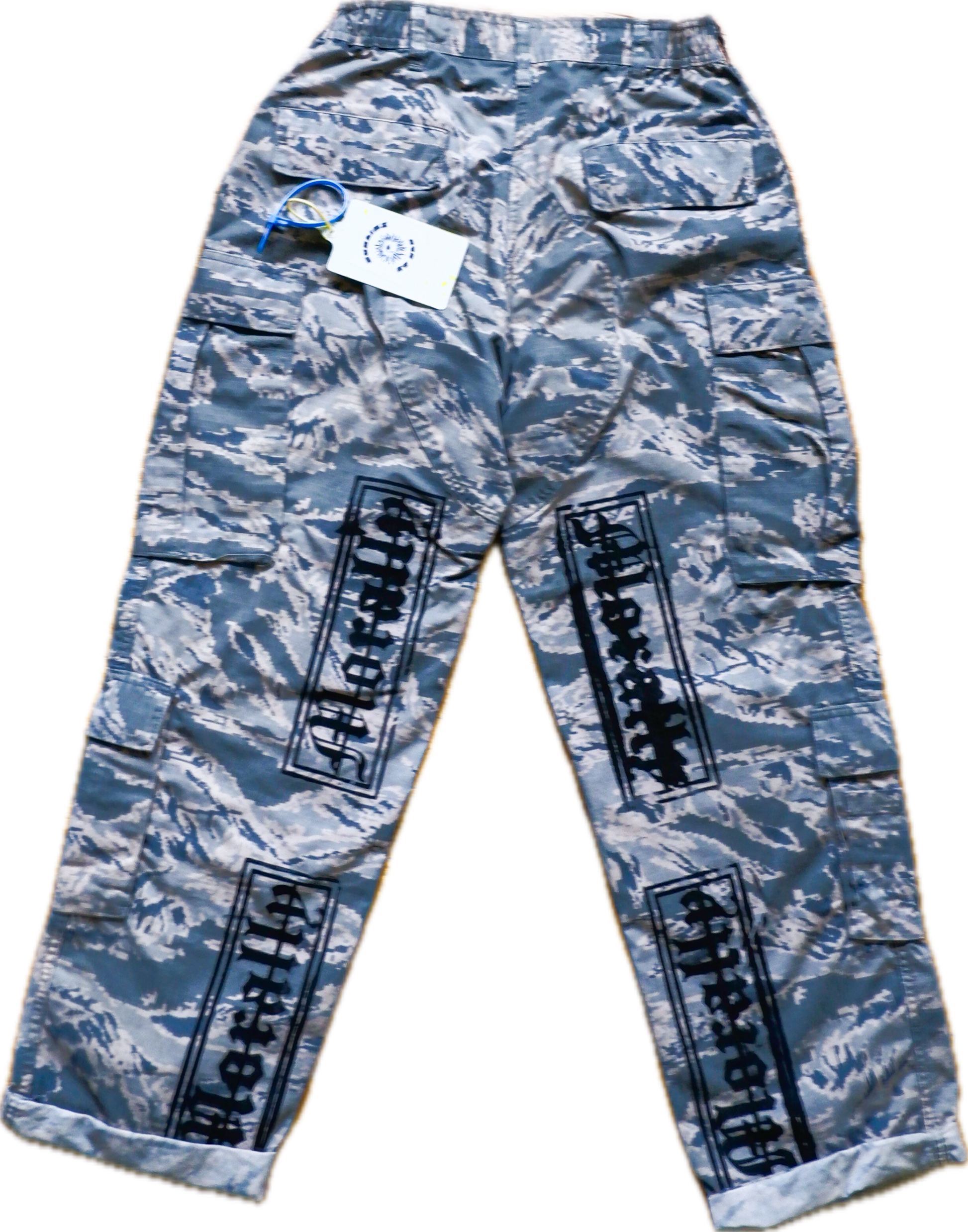 Small ABU Camo pants “Morally” Green repeatedly down both legs.