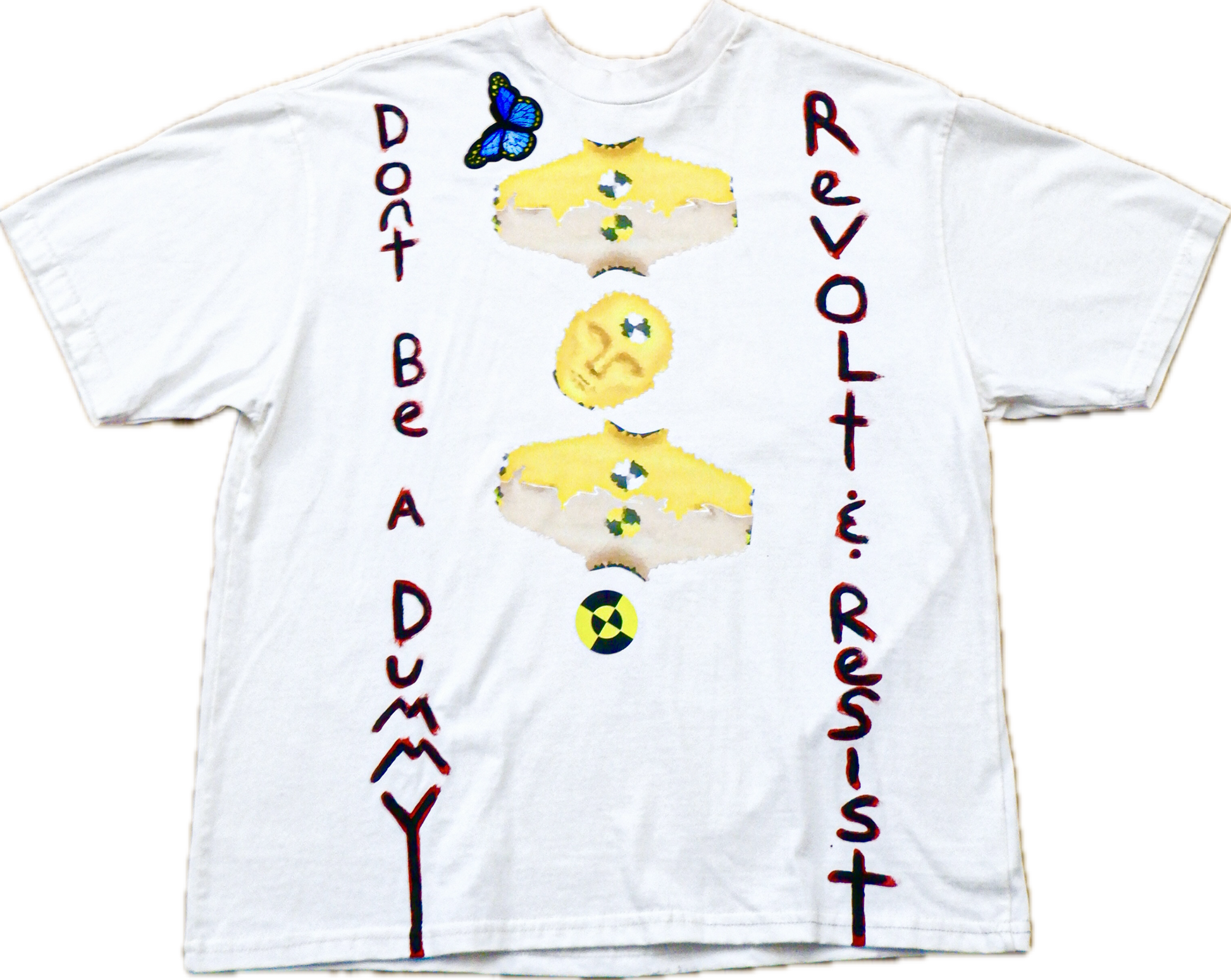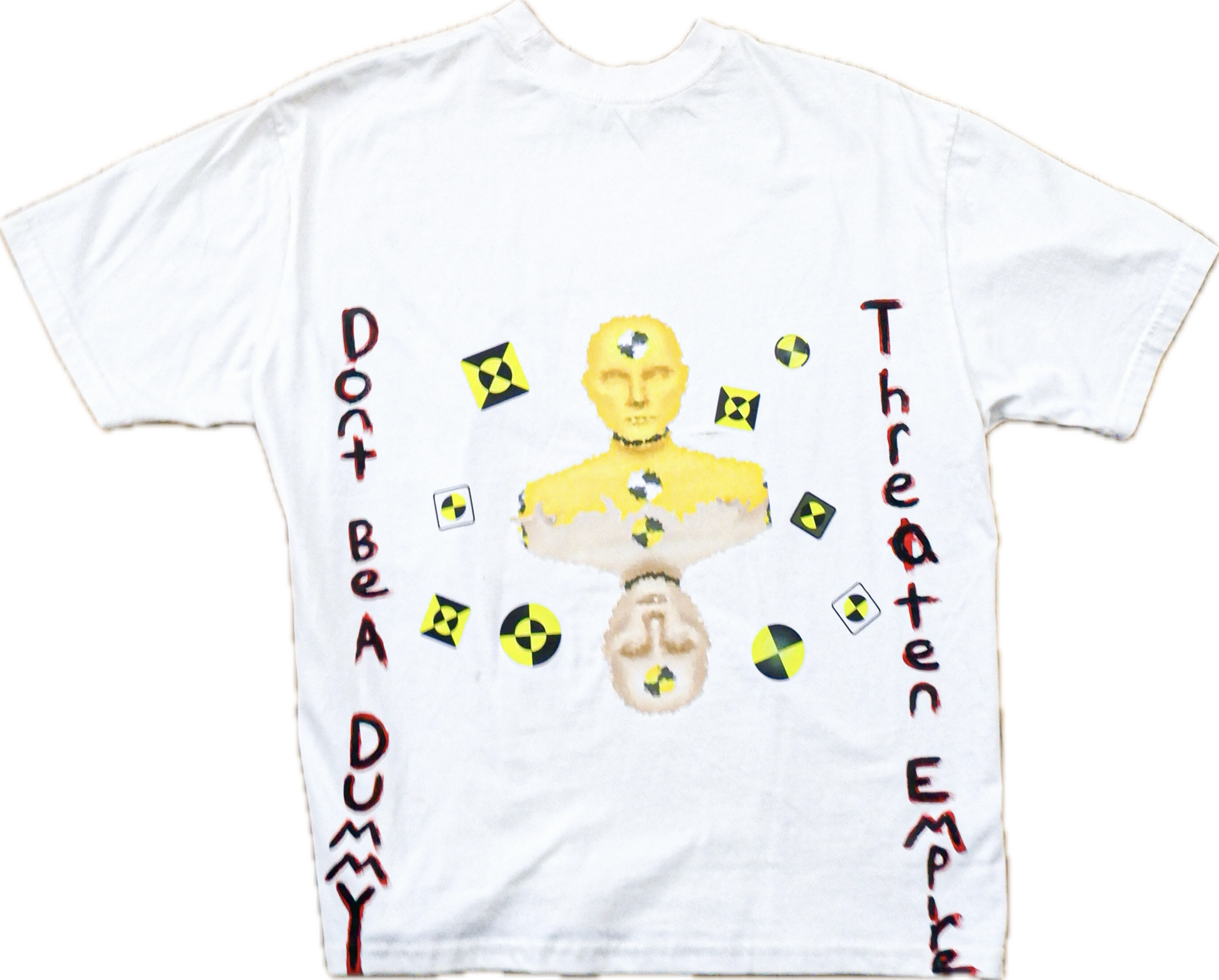Small Oversized white tee featuring “Don’t Be a Dummy / Threaten Empire” in bold red hand-painted, while the back “Don’t Be a Dummy / Revolt & Resist.”