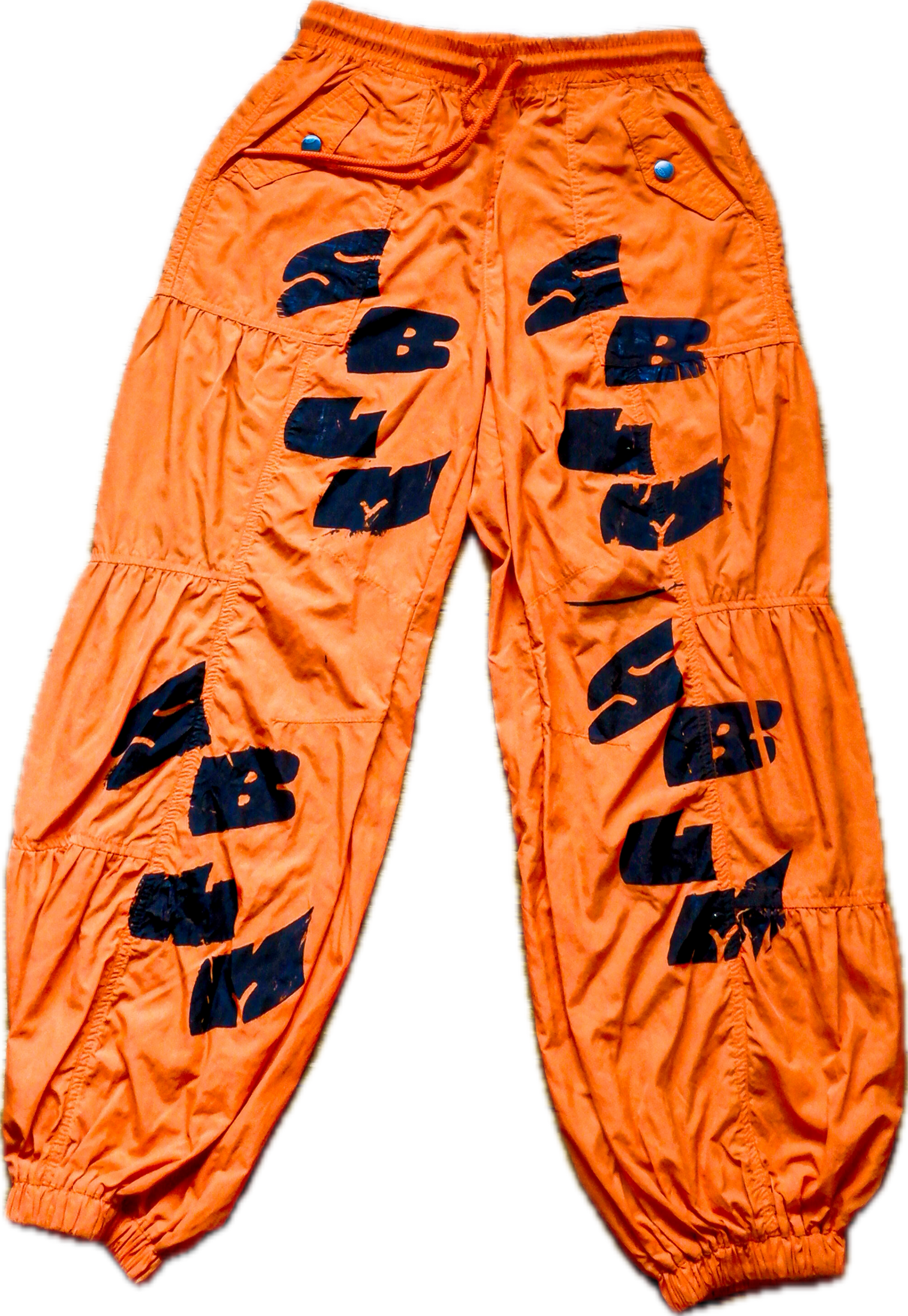 Orange parachute pants with Black SBLM running down both legs.